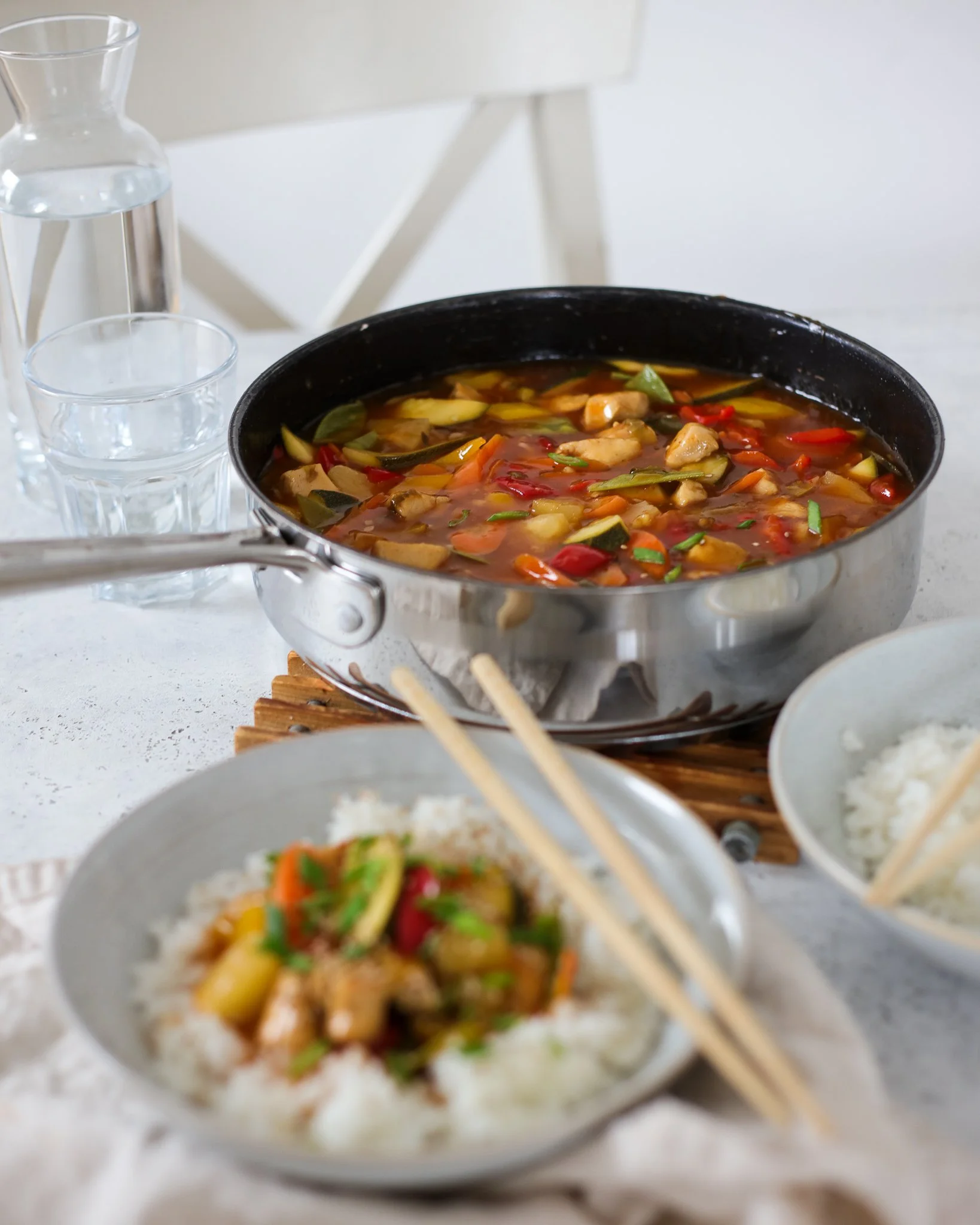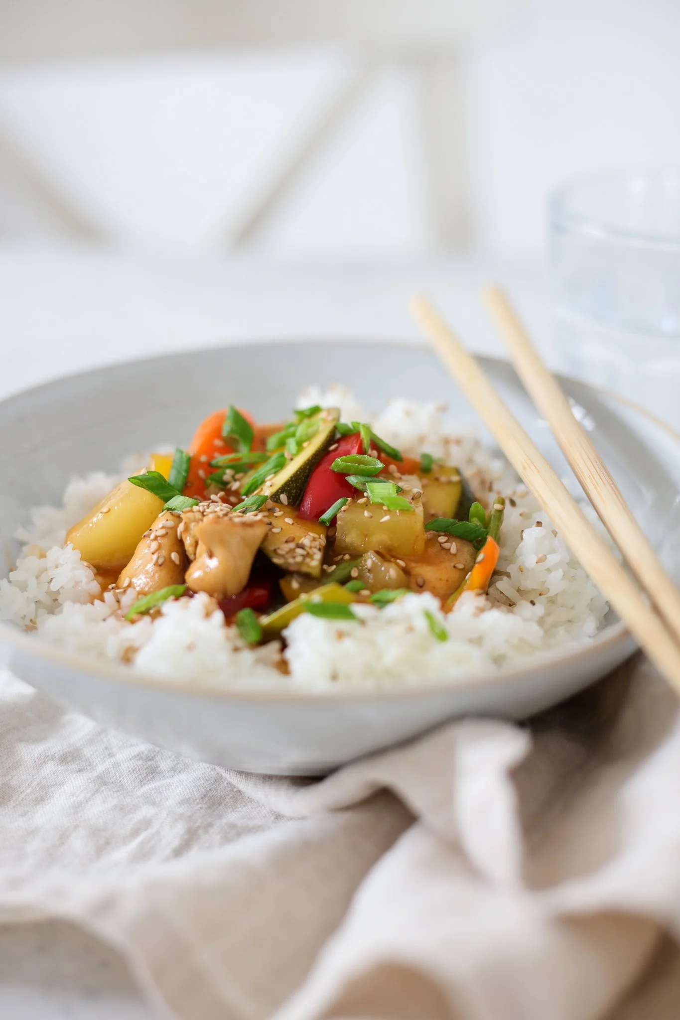 Das Gemüse klein schneiden: Paprika würfeln, Zucchini und Karotten halbieren und etwas schräg in Scheiben schneiden. Die Frühlingszwiebel in feine Ringe und den Knoblauch klein schneiden. Die Ananas aus der Dose in kleine Stücke und die Erbsen (oder Brokkoli in feine Röschen gezupft) waschen und eventuell halbieren, diese kommen erst kurz vor Schluss ins Rezept.