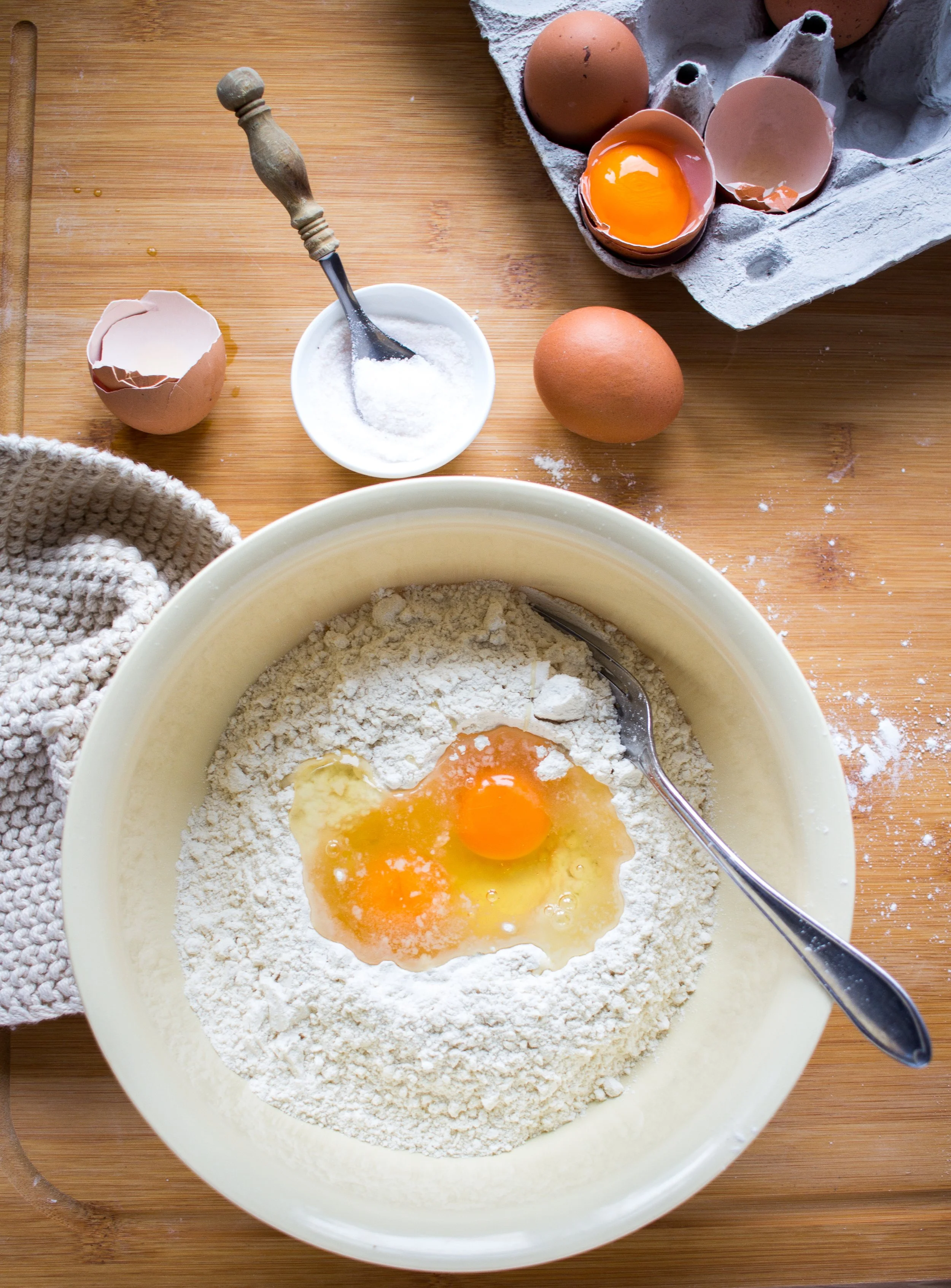 Das Mehl in eine Schüssel geben und in die Mitte mit einer Gabel eine Vertiefung eindrücken. In die Vertiefung kommen Salz, die Eier und das Öl. Nun vorsichtig mit der Gabel die flüssigen Zutaten vermischen und langsam das Mehl rundherum einarbeiten. Solange mit der Gabel das Mehl unterkneten bis ein brösliger Teig entstanden ist. Diesen Teig nun gut 3-5 Minuten mit der Hand verkneten, um eine schöne geschmeidige Kugel Teig zu erhalten. Manchmal benötigt der Teig noch einen kleinen Schluck Wasser, manchmal nicht, das kommt ganz auf das verwendete Mehl und die Größe der Eier an, aber man spürt beim Kneten ob der Teig eher trocken wird oder geschmeidig.