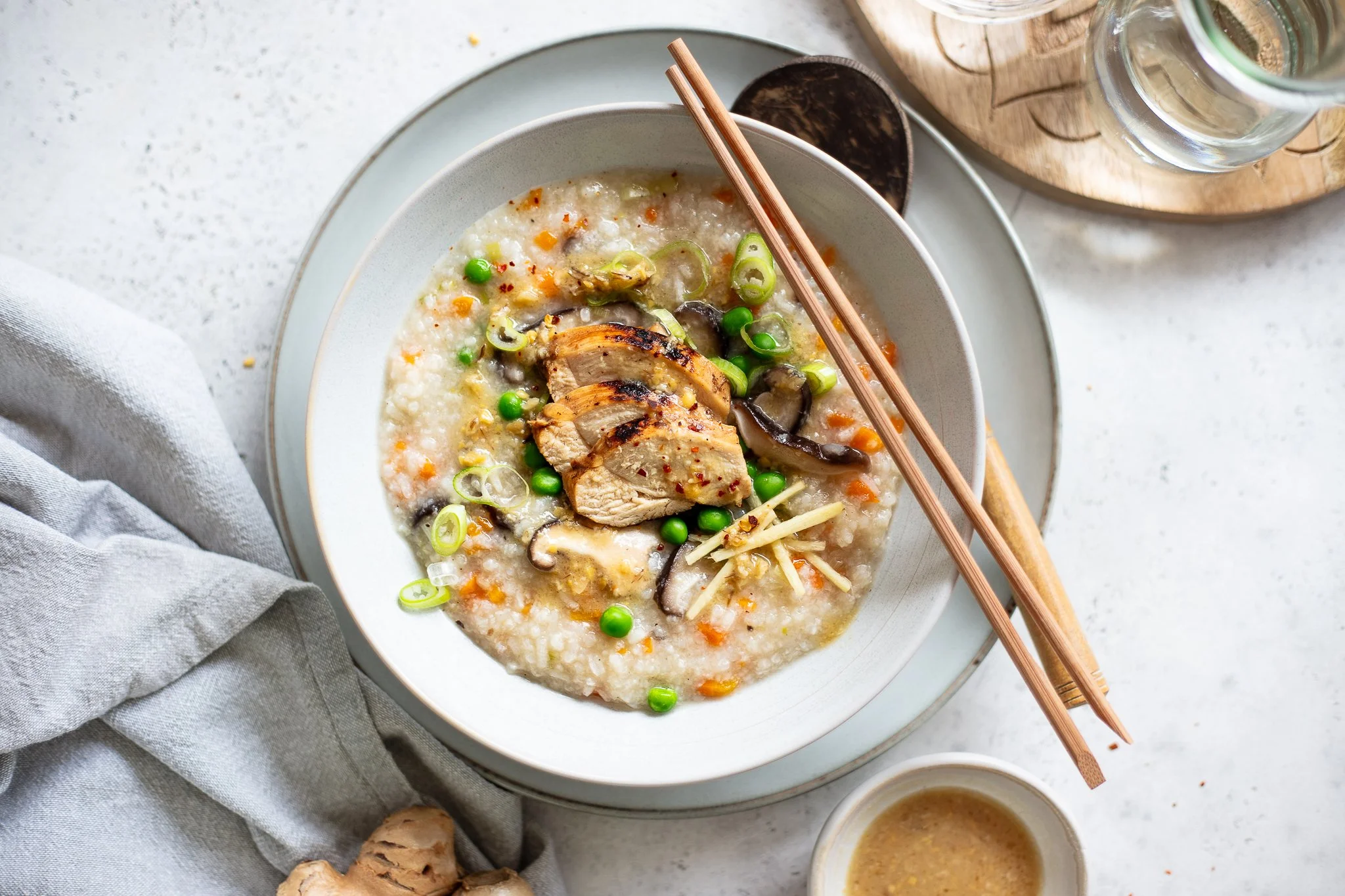Sobald die Suppe zu köcheln beginnt den Reis abgießen und mit dem Gemüse, den Zwiebeln und dem geriebenen Ingwer dazu geben. Einmal ordentlich aufkochen lassen und dann die Hitze reduzieren. Die Suppe sollte ca. 50 Minuten leicht köcheln, dabei immer wieder umrühren. So zerfällt der Reis und bringt eine tolle Konsistenz in dieses Gericht. Mit Salz, Pfeffer, einen Spritzer Sojasauce und Zitronensaft würzen und abschmecken. (Sollte die Suppe zu dick sein, etwas Wasser nachgießen.)
