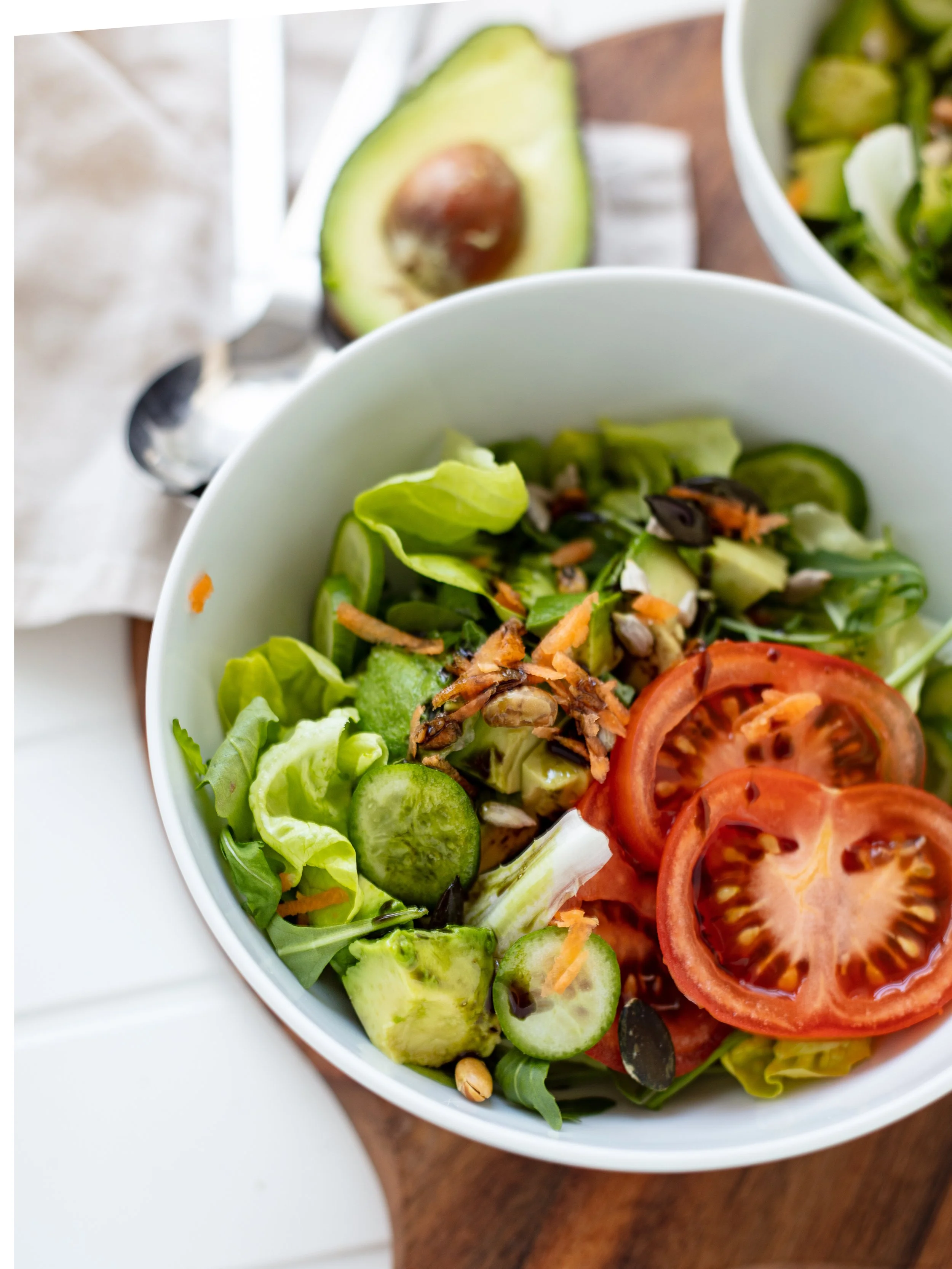Salat waschen, trocken schleudern und auf zwei Schüsseln aufteilen. Gurken, Frühlingszwiebel und Tomaten klein schneiden und über die Salate verteilen. Eine Avocado halbieren, entkernen und rautenförmig einschneiden - so kann das weiche Fleisch gleich direkt in Form von Würfeln aus der Schale gedrückt werden.